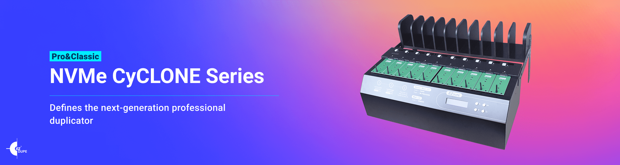 NVMe CyCLONE utilizes PCIe technology to achieve high-speed M.2 SSD copying and erasing capabilities, while also offering the functionality of daisy-chain and connecting the external printer. It defines the next-generation professional duplicator.