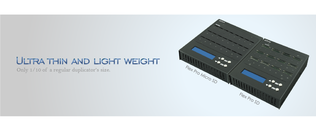 10th July 2015 Flex Pro is a powerful commercial grade duplicator which can copy 23 pcs of SD or microSD cards simultaneously. It has high output capacity but only takes up to 1/10 of a regular duplicator space. Bundled with special user menu, the compact and light weight Flex Pro is ideal for workplaces with space limitation such as a small retail shop or office.