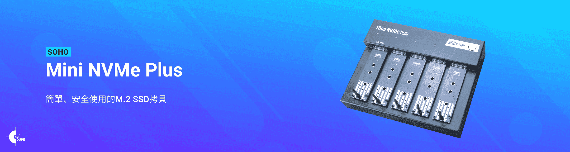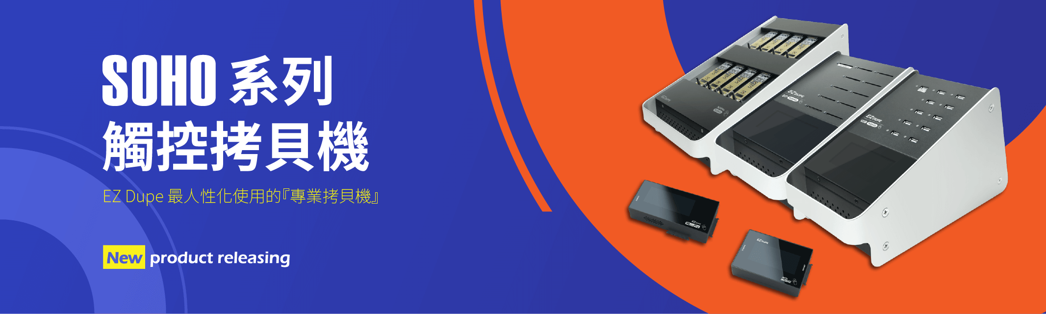 本系列產品取名SOHO,仍針對個人工作室及小型辦公室所設計,直覺式操作介面,使用極容易上手,可增加個人及辦公室的工作效率。本次發表5款產品,涵蓋NVMe、HDD/SSD、USB、SD卡等常用的儲存裝置。麻雀雖小五臟俱全,SOHO系列產品除拷貝功能外,比對、格式化及抹除等專業拷貝機具有的功能無一不備。